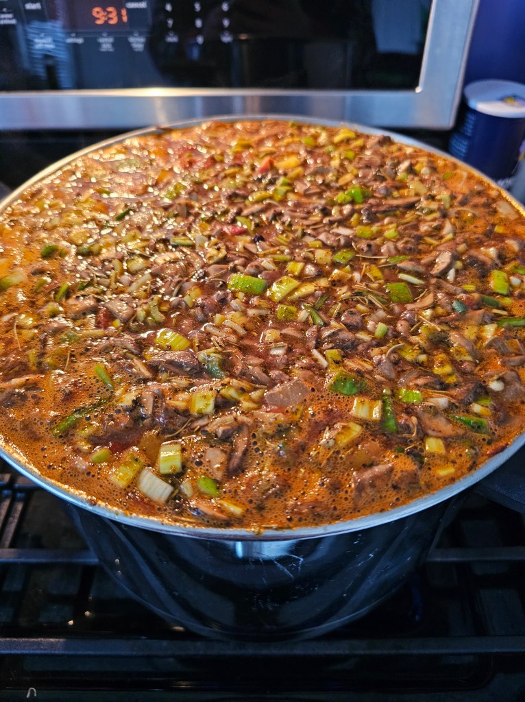 – 3 quarts of beef broth. Yes, I know, beef is bad for the planet but unless you can show me where to get venison or elk broth then shut up.